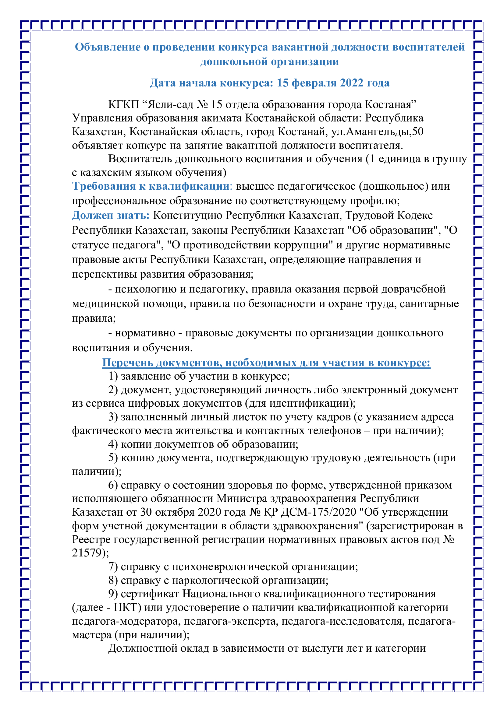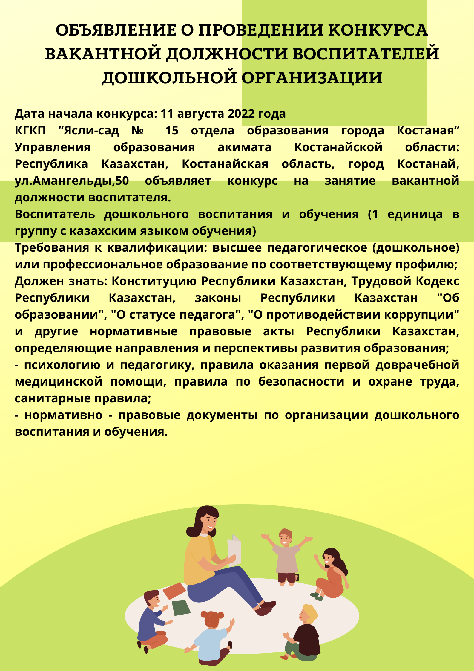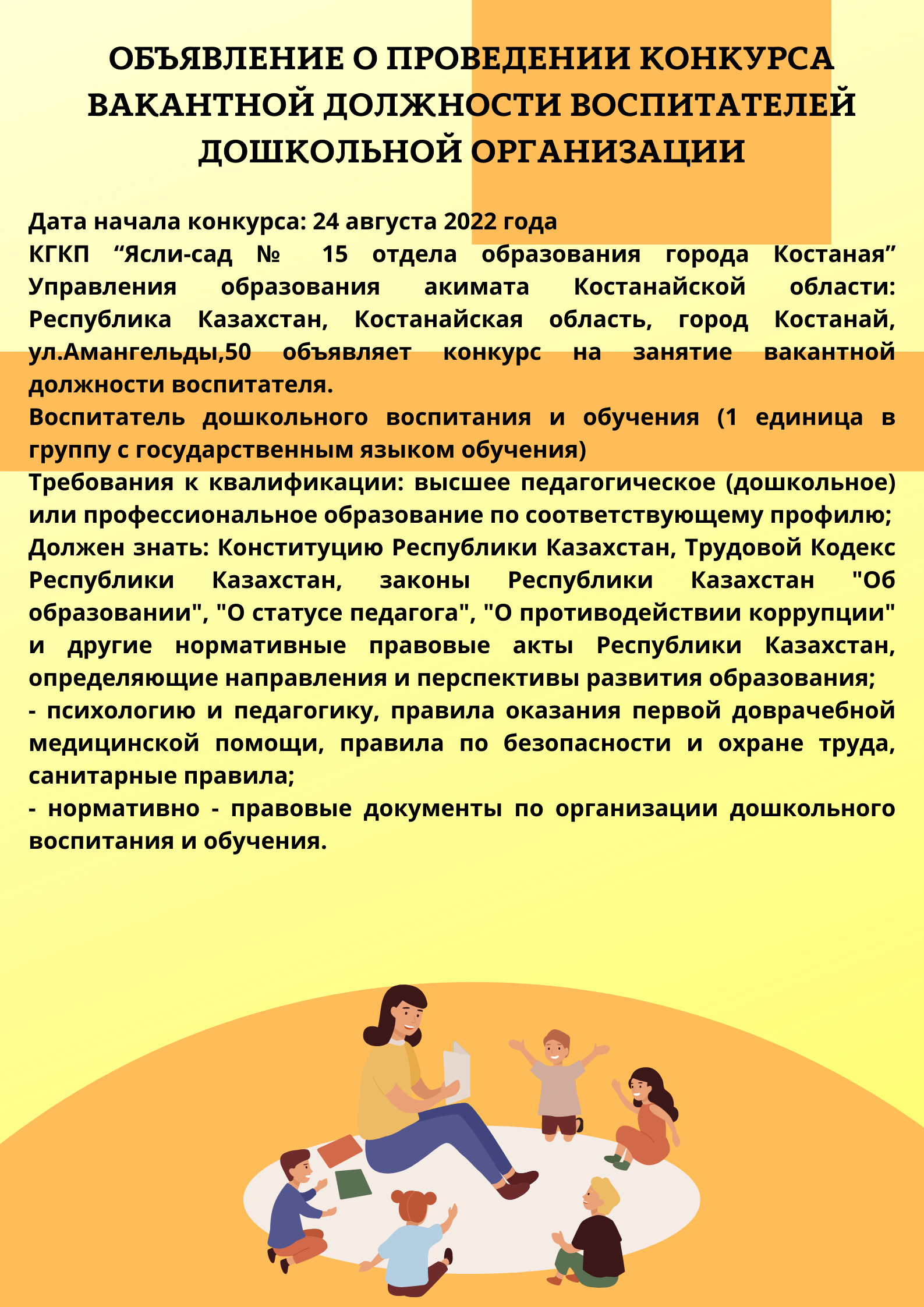 КГКП “Ясли-сад № 15 отдела образования города Костаная” Управления образования акимата Костанайской области: Республика Казахстан, Костанайская область, город Костанай, ул.Амангельды,50 объявляет конкурс на занятие вакантной должности воспитателя.