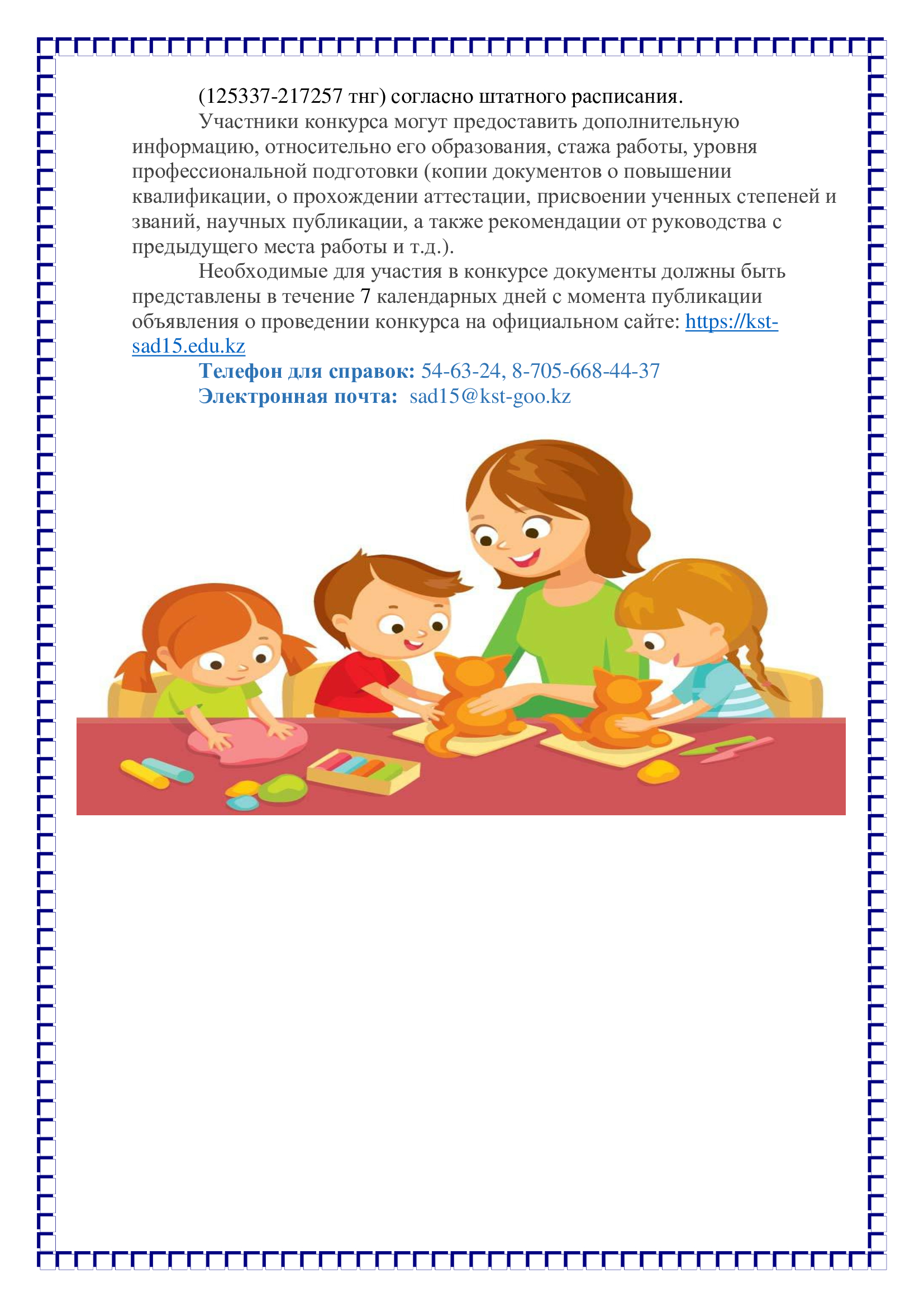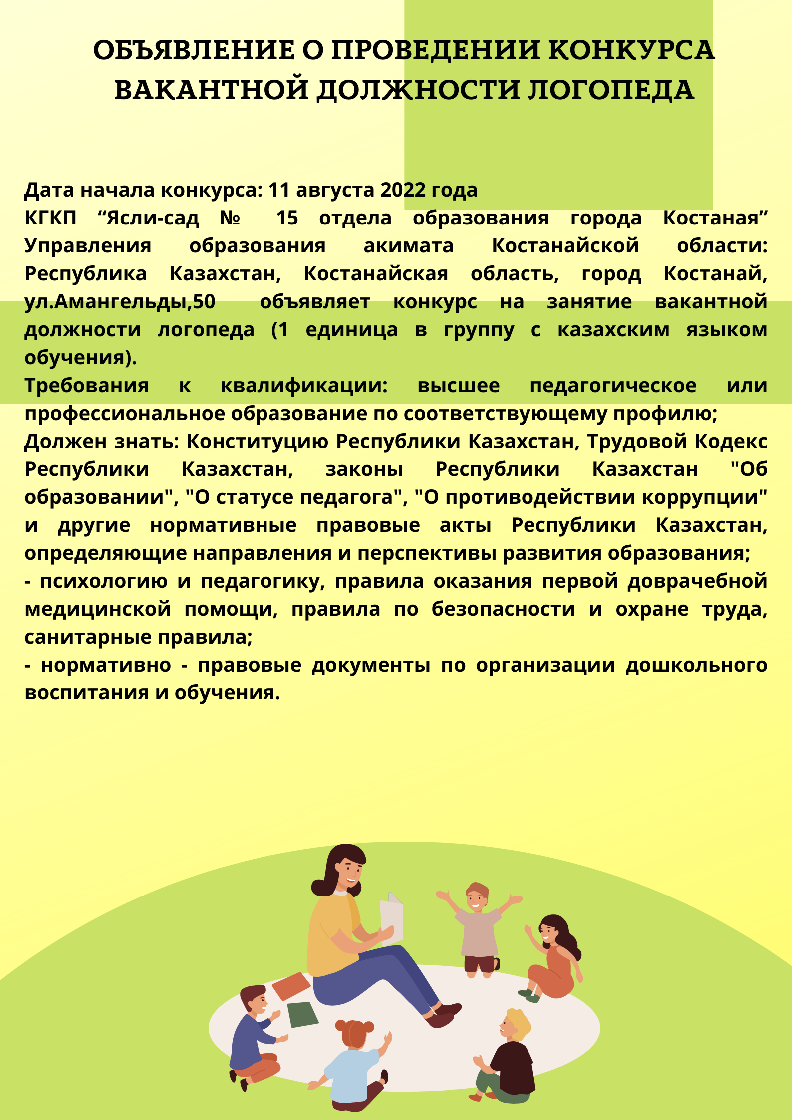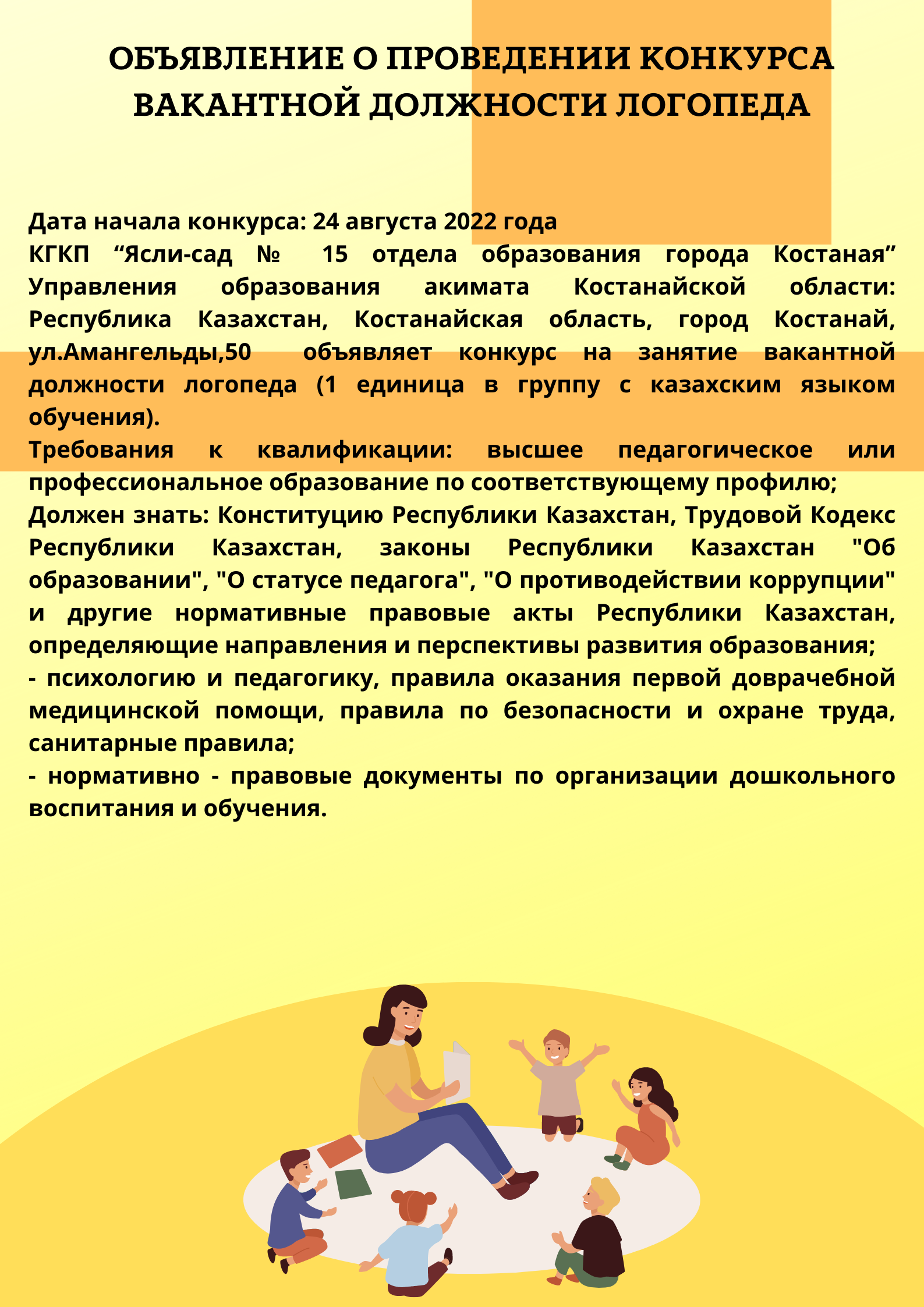 КГКП “Ясли-сад № 15 отдела образования города Костаная” Управления образования акимата Костанайской области: Республика Казахстан, Костанайская область, город Костанай, ул.Амангельды,50 объявляет конкурс на занятие вакантной должности воспитателя.