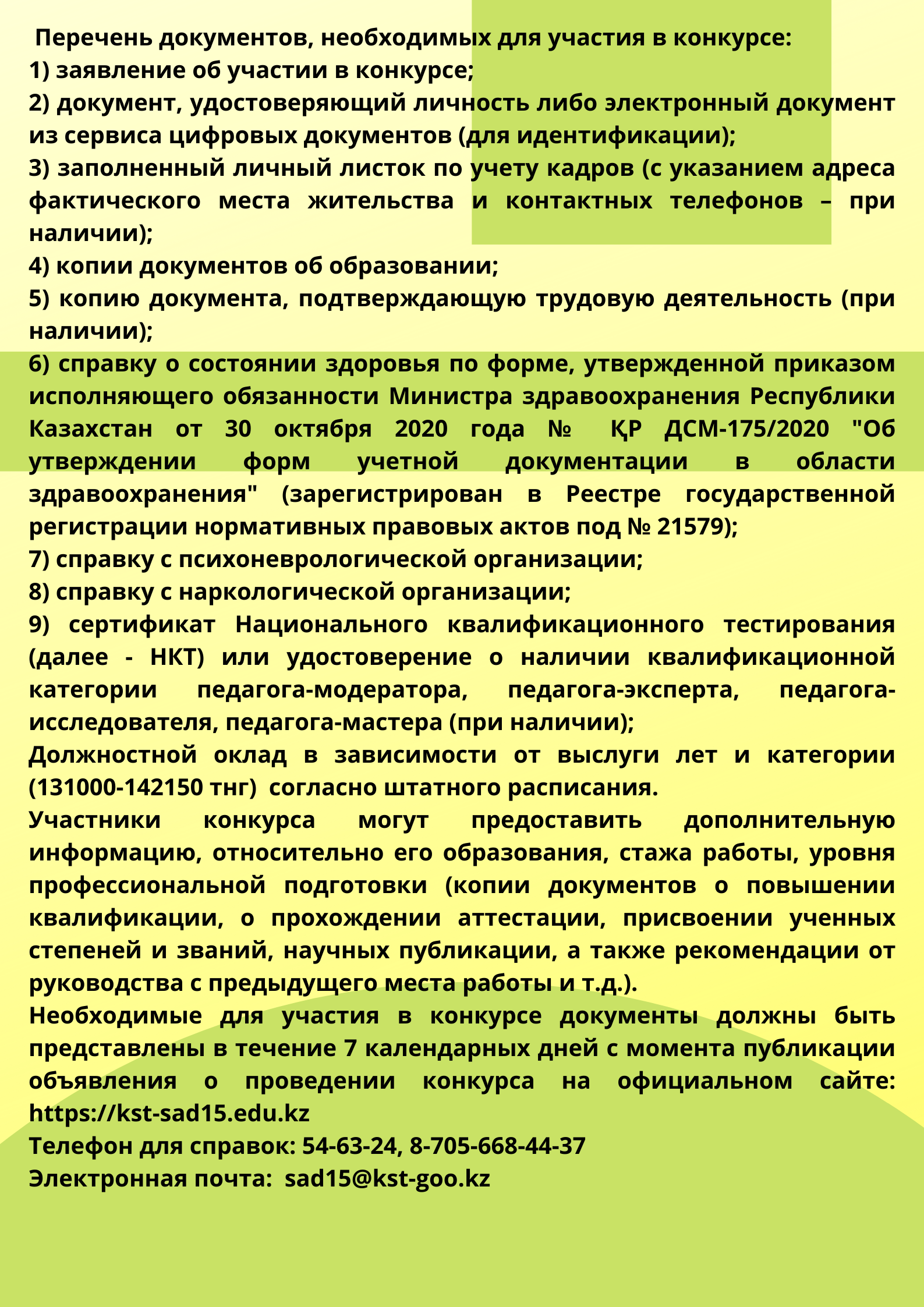 Необходимые для участия в конкурсе документы должны быть представлены в течение 7 календарных дней с момента публикации объявления о проведении конкурса на официальном сайте: https://kst-sad15.edu.kz